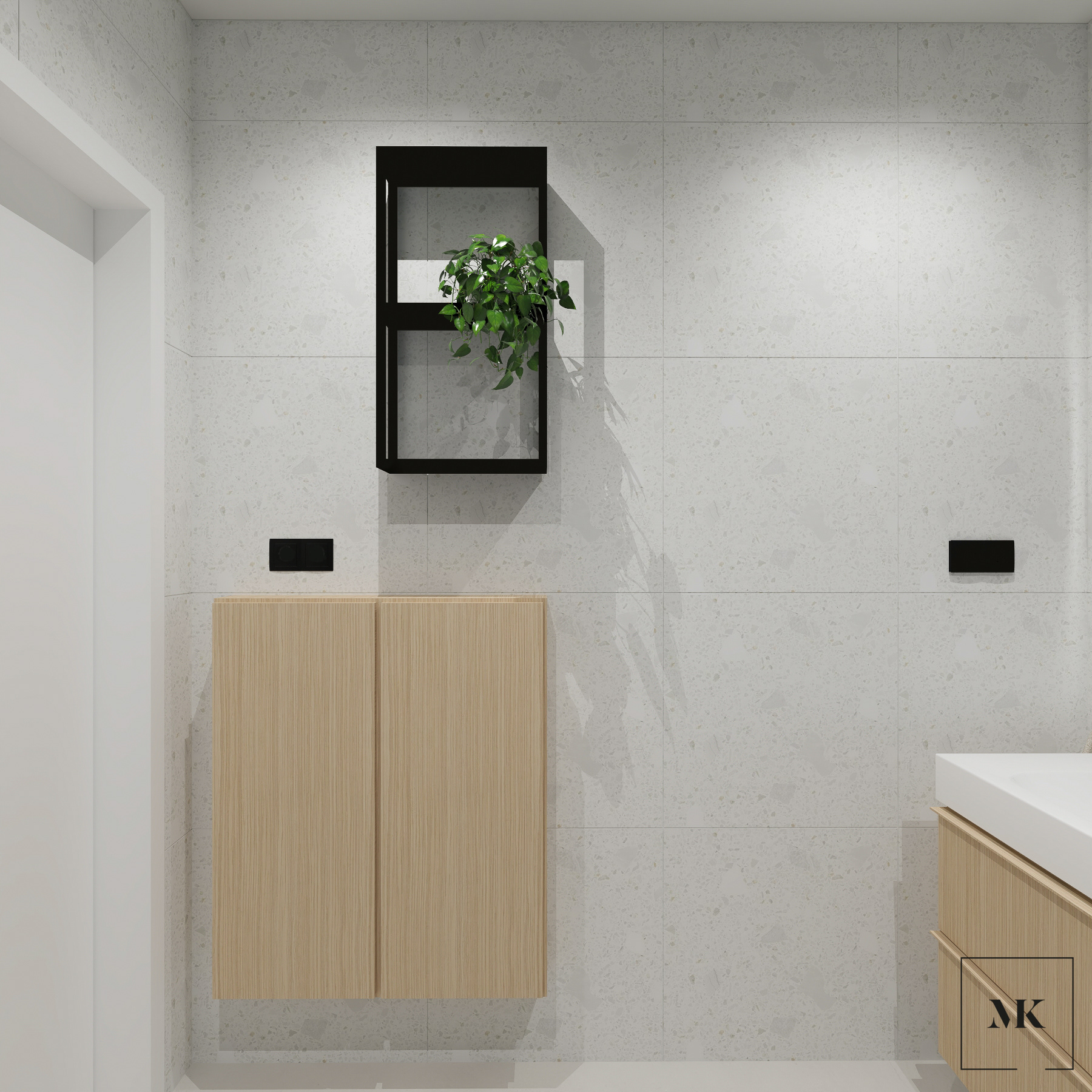 Na ścianach użyto dwóch rodzajów płytek. Pierwszy imituje lastryko i harmonizuje kolorystycznie z posadzką, co tworzy spójną kompozycję. Drugi to "brudny" granat, który w połączeniu z czarnymi dodatkami nadaje wnętrzu industrialnego charakteru. Ten kontrastowy efekt dodaje również głębi i dynamiki łazience.